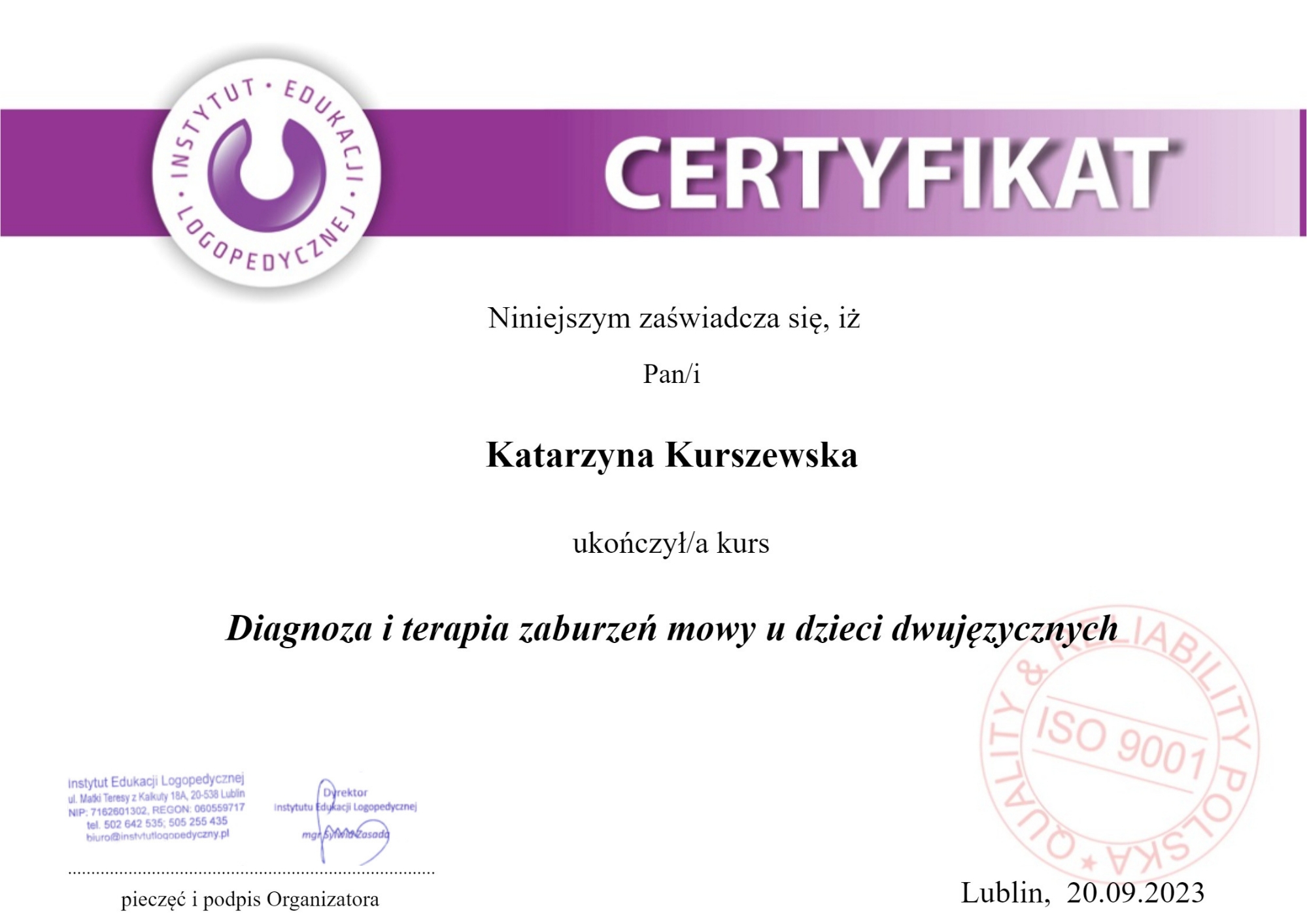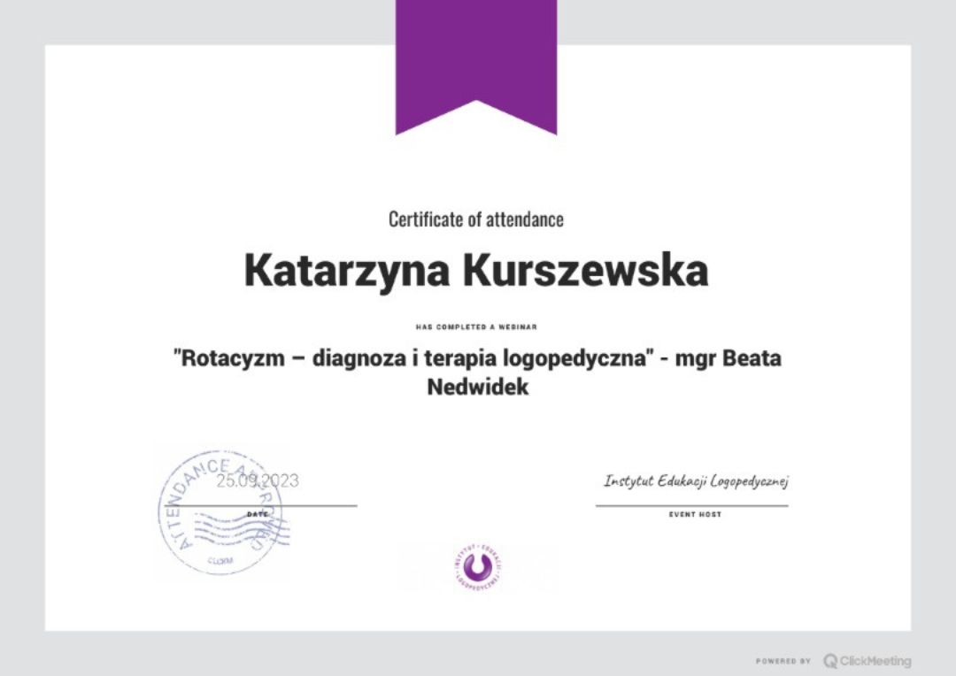 Aby sprostać potrzebom najmłodszych podopiecznych wciąż doszkalam się jako logopeda. Od nie dawna poznałam swoją nową pasję, którą jest logopedia. Efekty mojej pracy jako logopeda są bardzo satysfakcjonujące i motywujące do dalszego poszerzania swojej wiedzy z dziedziny logopedii.